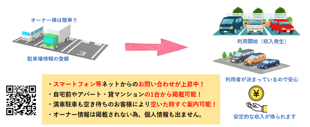 駐車場オーナー様・不動産会社様が所有・管理されている駐車場を、ユーザー様への訴求効果がある当社運営サイトに無料で掲載させていただきます。